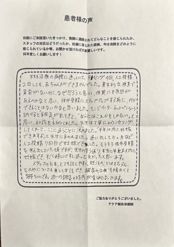 そろそろ体外受精を考え出していた頃ですが、先生の言う通り、本当に半年以内に妊娠でき、すごく嬉しいですし、通って良かったと思います。