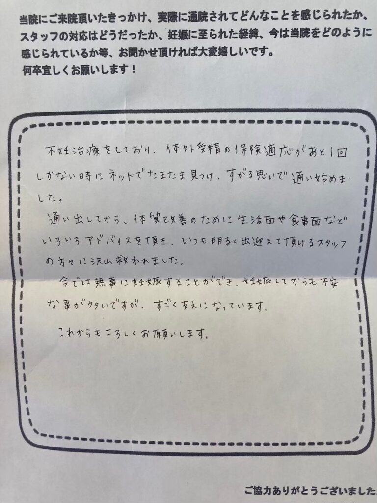 不妊治療をしており、体外受精の保険適応があと1回しかない時にネットでたまたま見つけ、すがる思いで通い始めました。