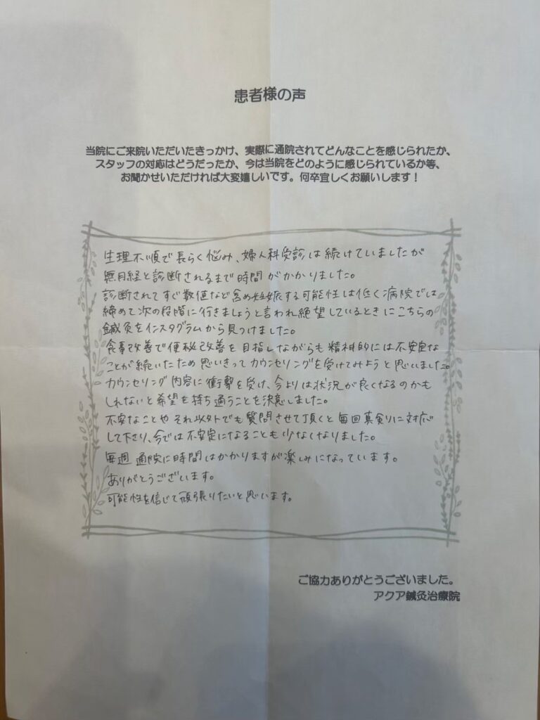 診断されてすぐ数値など含め妊娠する可能性は低く、病院では「諦めて次の段階に行きましょう」と言われ絶望しているときにこちらの鍼灸をインスタグラムから見つけました。