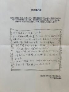 これから胚移植に向けて、引き続きこちらでしっかりとサポートを受けながら治療を続けたいと思っております。